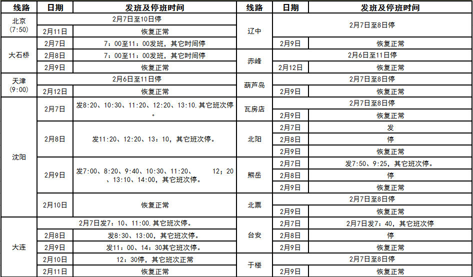 2016年春節(jié)假期班次發(fā)車情況